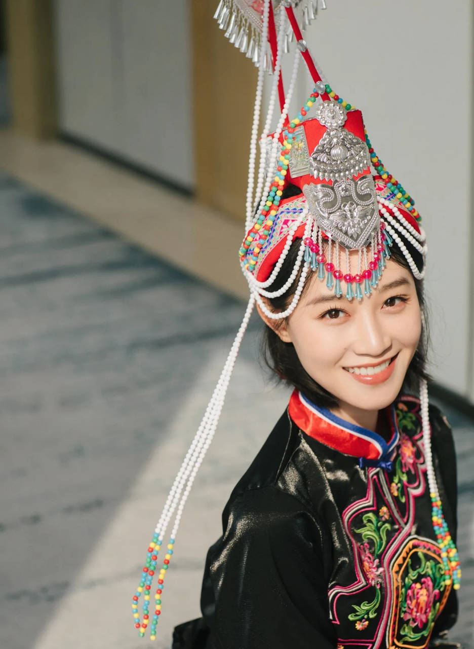 最让人意外的是她的素颜状态:没有浓妆遮盖的雀斑在阳光下格外清晰,眼下淡淡的黑眼圈反而透着真实的生活气息。要知道,就在半年前,她还因“苦相脸”被群嘲“演不了大女主”。而此刻,她戴着重.2公斤、由非遗传承人耗天打造的凤凰冠,在竹竿舞队伍里笑得见牙不见眼,银饰碰撞声清脆得像山涧泉水。